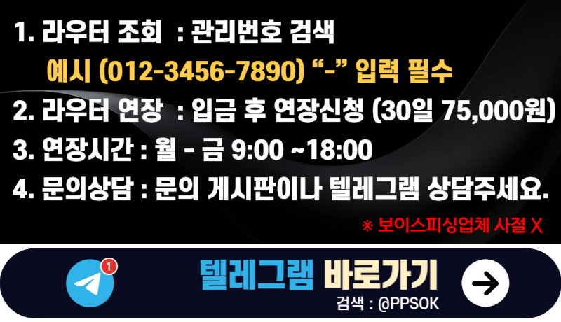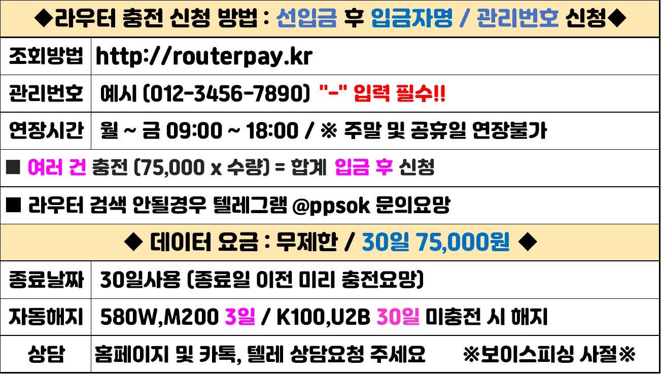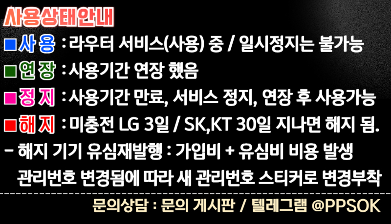 라우터조회 “-” 입력필수 라우터조회조회방법사용상태안내■ 해지상태시 유심재발행 필요 관리자 연락주세요.■ 정지상태시 연장가능 빠른 충전요망관리번호통신사모델명라우터번호유심번호바코드번호대리점연장상태수정검색관리번호요금제통신모델명라우터번호유심번호종료일상태관리번호를 검색해 주세요 라우터연장 신청접수 연장신청연장안내■ 조회안됨,해지기기 상태시 관리자 연락주세요. ■ 여러건 연장시에는 관리자 연락주세요. 연장신청 신청일관리번호입금자명연장기간신청현황 2025-04-03012-26**-9***유*희 75,000원 / 30일연장완료2025-04-03012-23**-7***공*철 75,000원 / 30일연장완료2025-04-03012-23**-1***공*철 75,000원 / 30일연장완료2025-04-02012-48**-4***오*수 75,000원 / 30일연장완료2025-04-02012-48**-2***진*준 75,000원 / 30일연장완료 연장신청 201202203204205206207208209210Powered by MangBoard | 망보드 스토어